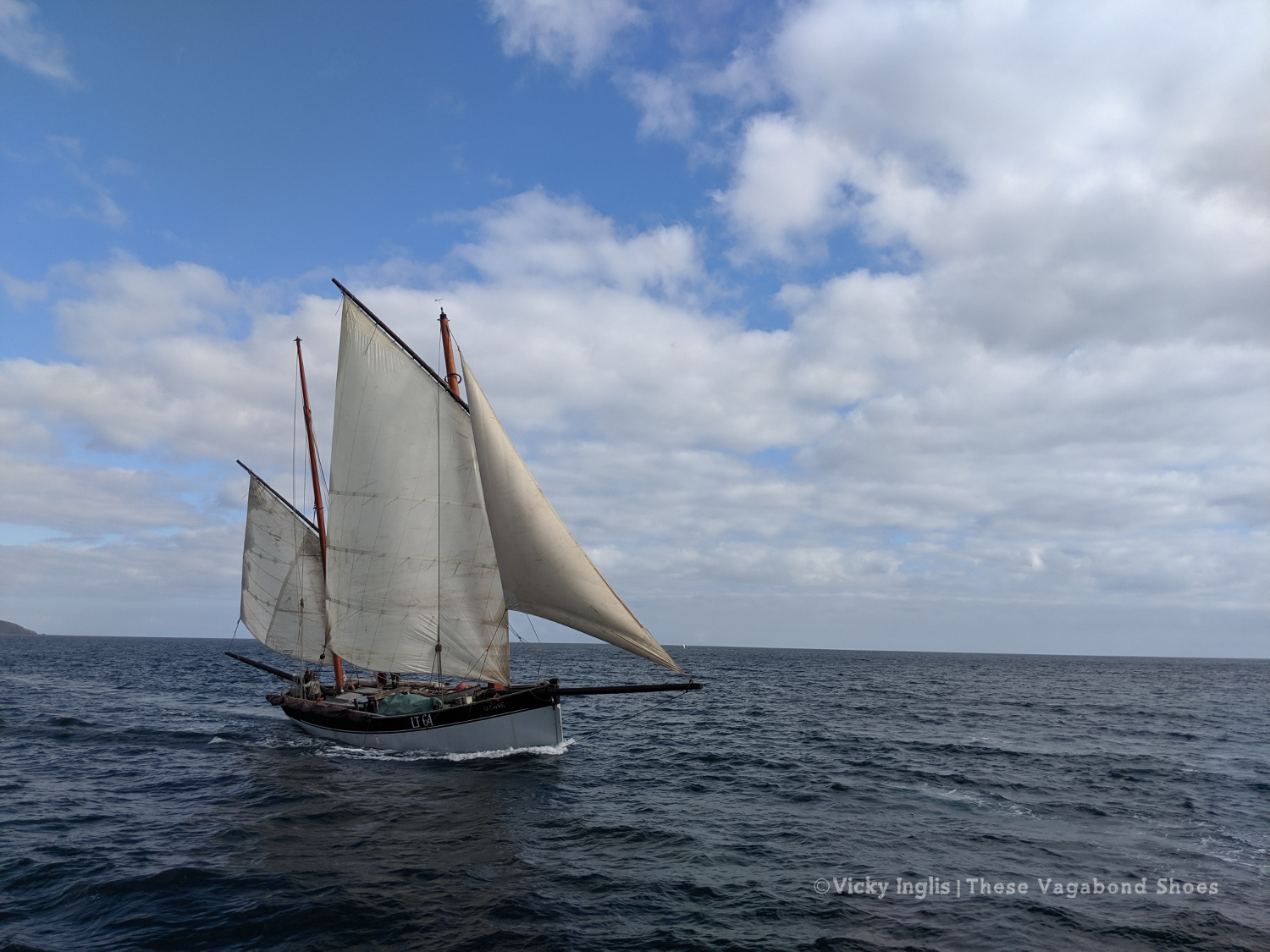 At the end of my leave, I returned to Irene in Swansea, to move her round to Cornwall for the final months of the season. We stopped off at Lundy on the way, anchoring overnight beneath the cliffs. A 1am wake-up call to move anchor at the turn of tide turned out to be one of the most magical experiences of the voyage, as thousands of Manx shearwaters swirled through the air around us, through the rigging, and called out from their burrows. A stowaway bird emerged from the hawsepipe the following morning, and I helped her back to the sea.
