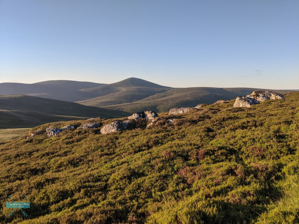 I’ve been attempting to accumulate more Quality Mountain Days (QMDs) since completing the course, but now with a clearer definition of what that means, I’m finding it’s much harder than I anticipated. I took a wander out to my closest Munro, Mount Keen (939 metres / 3080′), departing from my front door and following the old drove road that crosses the Mounth from Ballater to Glen Esk, starting late and camping up high overnight and taking advantage of the extended warm, dry weather to cross the trackless expanse of bog to the west of the peak.