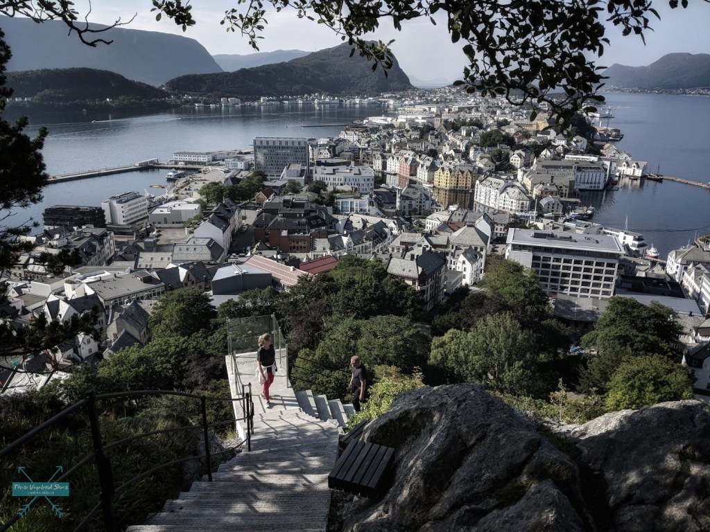 The view from Aksla Fjellstua is easily one of the most recognisable in Norway, and certainly among the most beautiful. Ice cream coloured buildings cluster around the harbours of the central three islands of Ålesund. The islands and skerries of wider archipelago lie dark in the sparkling water of Breidsundet to the west. And the sheer, often snow capped, peaks of the Sunnmøre Alps encircling the Hjørundfjord provide the backdrop to the south.