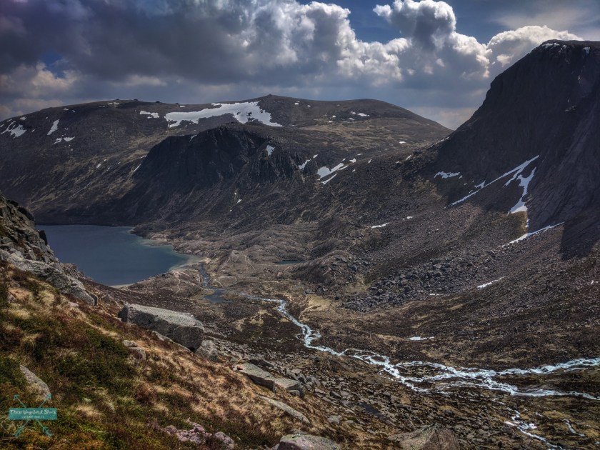Looking down into the Loch Avon basin in the heart of the Cairngorms plateau.